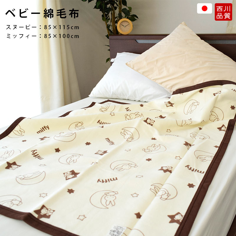 keyword | ベビー綿毛布 綿毛布 めんもうふ 毛布 もうふ 綿 cotton ベビー baby オールシーズン キャラクター スヌーピー snoopy ミッフィー miffy ブラウン ベージュ 日本製 西川毛羽部分綿100% ふんわりやわらかなベビー綿毛布。