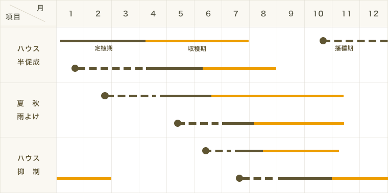 草勢は中強、スタミナ持続型根張りがよく、草勢は中強で栽培後半までスタミナが持続し、抑制栽培では初期生育がやや強勢に生育する。